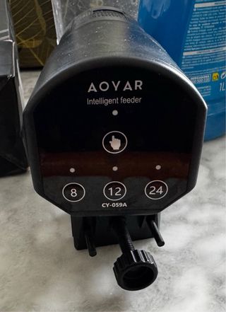 Comedero automático programable para acuarios de la marca Aoyar. - Modelo CY-059C. - Permite programar la alimentación cada 8, 12 o 24 horas. - Diseño moderno y compacto.