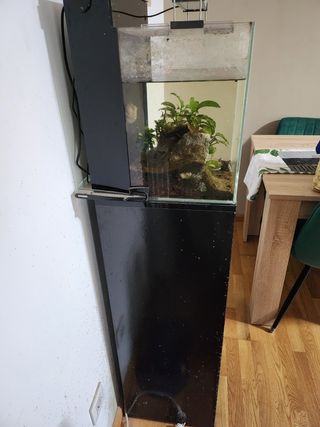 Acuario usado para tener gambas. Pierde un poco de agua por una junta. Incluido el armario para guardar los accesorios y demás.