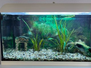 Acuario de 90 litros con todo lo necesario para empezar. - Filtro interno. - Calentador. - Plantas naturales. - Decoración de piedra. - Sustrato de grava.