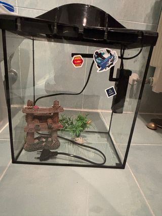 Acuario de 20 litros con todo lo necesario para empezar. Incluye filtro y elementos decorativos. - Filtro interno. - Decoración de roca y plantas artificiales. Tiene las patas (pequeños soportes de plastico triangulares que van con fieltro) Lleva 3 pegatinas que le puso mi hijo pero faciles de limpiar o eliminar. Si quieres que lo envíe no bajo de 25€ tiene que ir muy bien protegido al ser cristal.
