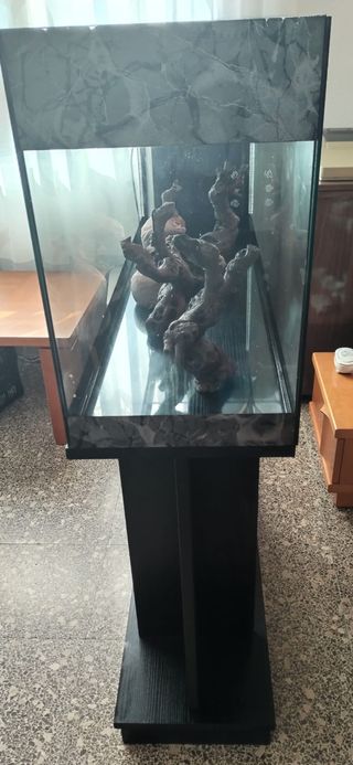 Acuario completo de unos 130/140 litros con su mueble y elementos decorativos macizos valorados en más de 100€. - Mueble de soporte en color negro. - Decoración interior con ramas macizas. - Detalles en el marco superior del acuario.