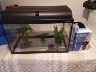 Acuario de 38 litros listo para usar. Incluye todo lo necesario para empezar. Incluye: - Acuario de cristal. - pantalla led. - Termómetro. - Filtro Aquaclear 30 - Calentador sera Medidas 45x30x28 Todo en perfecto estado .