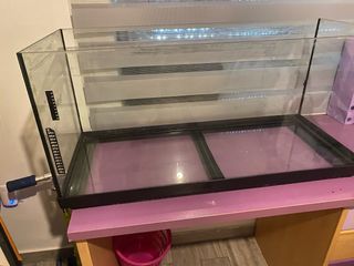 Acuario con estructura de plástico y paredes de cristal. - Tapa negra. - Cristal 6mm - 100lts Se regalan todos los accesorios. Termómetro, decoración, filtro de mochila, comedero automático, limpia fondos, calentador...