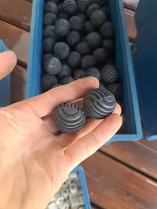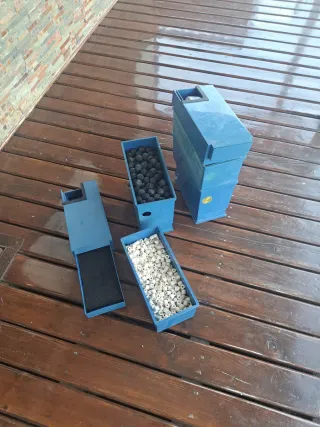 Sistema de filtración biológica para acuarios y estanques. Incluye diferentes tipos de material filtrante. - Módulos de filtración de plástico azul. - Material filtrante cerámico. - Material filtrante bolas biológicas. - Esponja filtrante. - uno de los cajones no lleva esponja, pero las hay de repuesto en amazon o aliexpres se recortan a medida y listo.