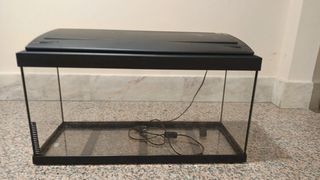 Acuario de cristal con tapa negra. Impecable con calentador incluido - Diseño moderno y elegante. - Ideal para mantener tus peces en casa.