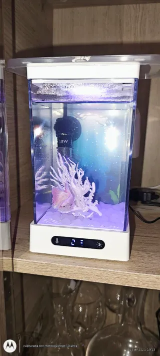 2 Mini acuarios con iluminación LED 3W y control de temperatura. - Pantalla digital con termómetro hasta 30°. - Conectividad a aplicación web. - Incluye calentador de 6W integrado. - Capacidad 1,5L cada uno. - Incluye instalación para bomba de aire - No incluye los peces y la bomde aire de oxigenacion.