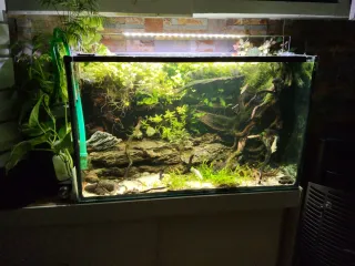 Acuario de 80 litros con un diseño moderno y elegante. - Dimensiones: 80 litros. - Incluye filtro cascada y calentador. - Iluminación LED integrada. - Incluye sifón (nuevo) para limpieza del fondo. - Incluye tapa. precio negociable