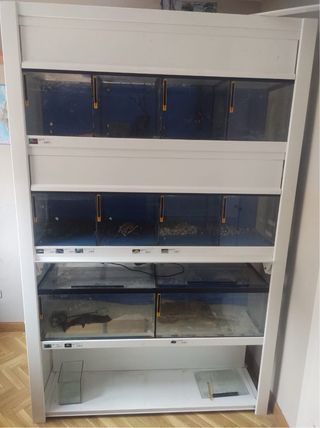 Mueble expositor para acuarios. - Estructura blanca. - Múltiples compartimentos para acuarios.