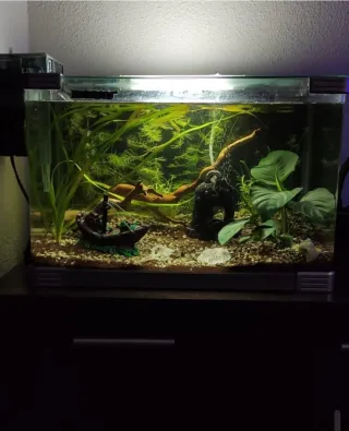 Acuario listo para usar con elementos decorativos. - Incluye figura de barco . Campana - Tronco de madera natural. Filtro . Calentador. Termómetro. Limpiador - Sustrato de grava. Largo 48 cm y ancho 30 cm y alto 32 con su tapa. Marca Boyu. Capacidad 50 litros.