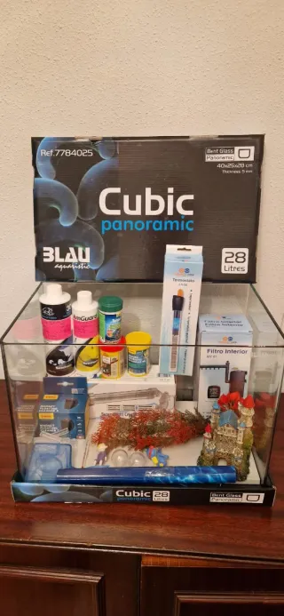 Se vende acuario Blau Cubic panorámico de 28 litros, ideal para iniciarse en el mundo de la acuariofilia. Incluye varios accesorios para su puesta en marcha. - Acuario de cristal curvo. - Calentador de acuario. - Filtro interior. - Tratamientos para el agua. - Decoración y figuras. - Limpiador magnético.