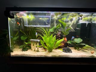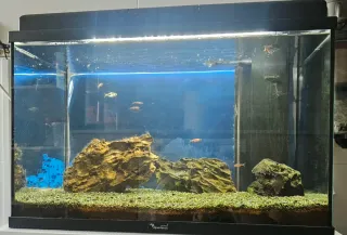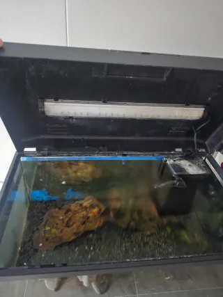 escucho ofertas Acuario listo para usar, con un diseño natural y plantas. - Incluye decoración y sistema de filtración. - Ideal para peces pequeños y medianos. iluminación filtros tronco plantas peces todo.