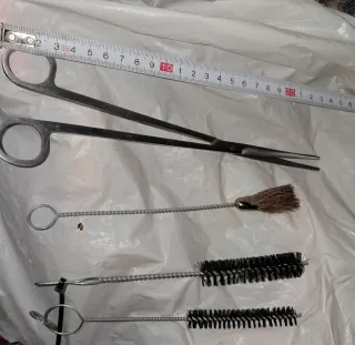 Set de herramientas para el cuidado de acuarios. Incluye tijeras y varios cepillos. - Tijeras de acero inoxidable. - Cepillo con cerdas naturales. - Dos cepillos con cerdas negras.