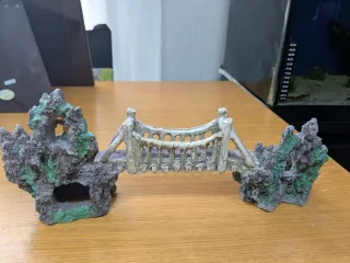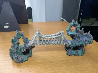 Adorno para acuario con diseño de puente y formaciones rocosas. - Puente de estilo rústico con barandillas. - Rocas con detalles verdes y morados. - Incluye una pequeña estructura tipo casa en una de las rocas.