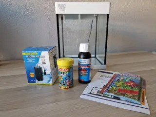 Acuario de 10 litros con diseño moderno y compacto. Incluye un filtro interno y comida para peces. - Acuario de cristal. - Filtro interno micro. - Comida para peces Dajana Basic. - Acondicionador de agua Easy-Life. - Manuales informativos.
