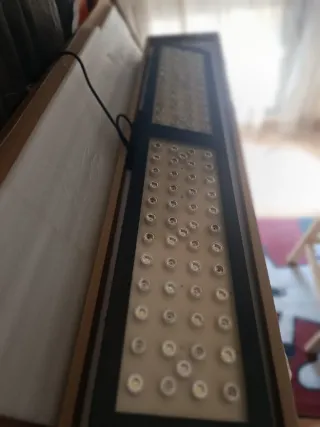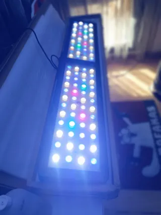 Lámpara LED Blau en buen estado y totalmente funcional. Longitud de 40 cm, con soportes extensibles originales (hasta +15 cm por cada lado), adaptable a distintos tamaños de acuario. Dispone de dos canales de iluminación regulables: • Luz blanca: iluminación principal, simula luz diurna. • Luz roja: luz complementaria para resaltar colores y favorecer el crecimiento de plantas. Incluye mando original Blau, que permite: • Encender luz blanca y roja de forma independiente o conjunta. • Regular la intensidad de cada canal por separado. Cuerpo de aluminio, bajo consumo y fácil instalación (soportes de plástico incluídos)