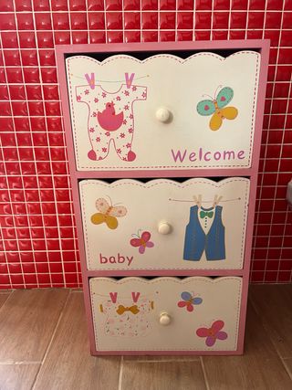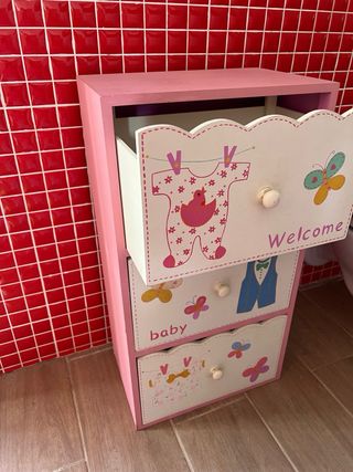 Mueble infantil de madera con tres cajones decorados. - Diseño con motivos de ropa de bebé y mariposas. - Tiradores redondos. - Acabado en rosa y blanco.