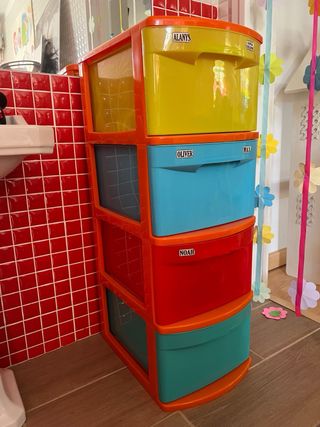 Práctica cajonera de plástico apilable, ideal para organizar tus pertenencias. - Diseño moderno y funcional. - Cada cajón tiene un color diferente: amarillo, azul, rojo y turquesa. - Tiradores integrados para facilitar la apertura.