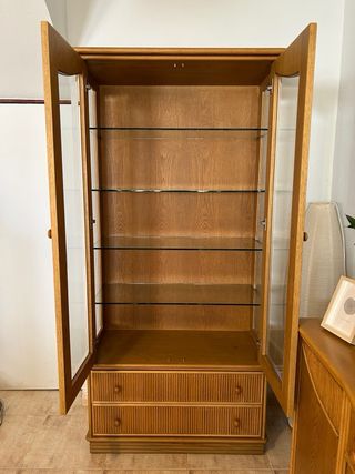 Elegante vitrina de madera de bambú con puertas de cristal y cajones inferiores. - Diseño con listones verticales en puertas y cajones. - Dos puertas de cristal con tiradores redondos. - Dos cajones amplios en la parte inferior. Imprescindible recogida Precio negociable