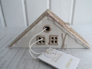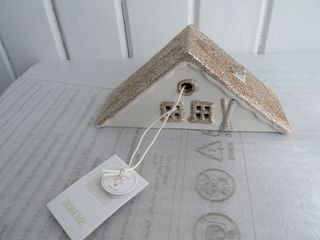 Casita de cerámica decorativa de Zara Home fabricado en porcelana blanca y presenta un llamativo tejado cubierto de purpurina dorada. Diseño: Representa una cabaña o refugio de esquí con un estilo minimalista y elegante. Incluye una luz en su interior que se filtra a través de las ventanas. Alto : 13.5cm Ancho : 11.5cm Fondo : 6.5cm Incluye pilas tipo botón LR44 Nuevo con etiquetas.