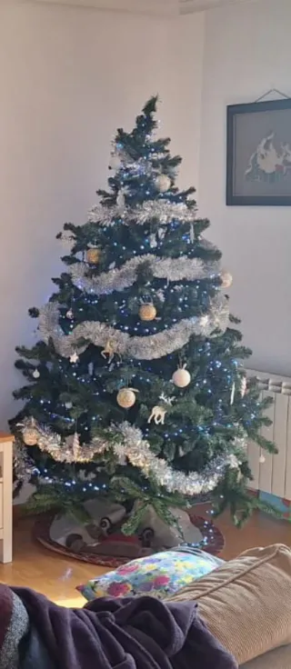 Árbol de Navidad de 1.50 metros de altura. Ideal para decorar tu hogar en estas fechas. Originalmente costaba 100€ Está como nuevo, solo lo he usado 3 navidades. Lo cambiamos por uno en tamaño real. - Diseño frondoso y realista. - Ramas flexibles para colocar adornos. (Se vende sin decoración) #ArbolDeNavidad #Navidad #SegundaMano #ArbolUsado #DecoracionNavidad #Hogar #Decoracion
