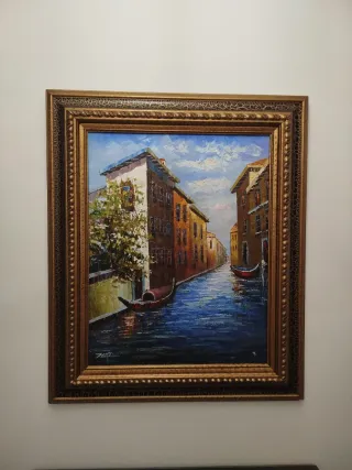 Preciosa pintura al óleo de un canal veneciano con góndolas. - Técnica: Óleo sobre lienzo. - Marco dorado incluido. - Medidas 80x 95cm.