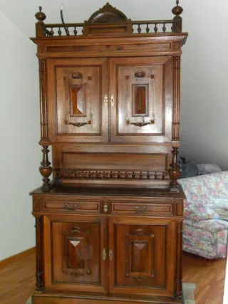 Elegante alacena antigua con un diseño clásico y funcional. Perfecta para añadir un toque de encanto a tu hogar. - Fabricada en madera de alta calidad. - Acabado en tono marrón oscuro. - Múltiples estantes para exhibición y almacenamiento. - Cajones y puertas inferiores para guardar objetos. - Se puede desmontar en dos muebles. - Medidas: 1.20m x 2m alto. En muy buen estado. Ideal para los amantes de las antiguedades, para dar un toque único a una casa o como mobiliario para tiendas. Solo venta en persona. No hago envíos.
