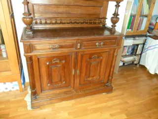 Mueble aparador alacena de estilo antiguo, con un diseño clásico y elegante. - Elaborado en madera maciza. - Dos puertas principales con paneles decorativos. - Dos cajones superiores con tiradores. - Detalles tallados en la parte superior y los laterales.