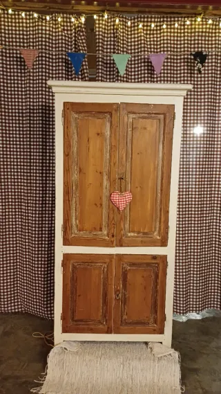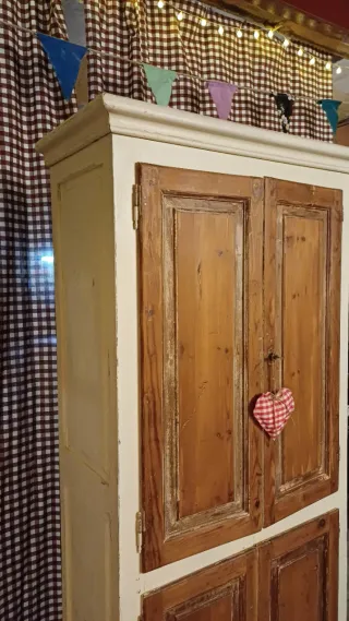 Precioso armario alacena antiguo de madera maciza restaurado. Ideal para darle un aire rústico a tu hogar. - Puertas superiores e inferiores. - Acabado en madera natural y blanco.