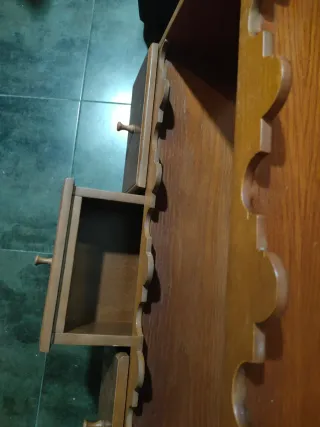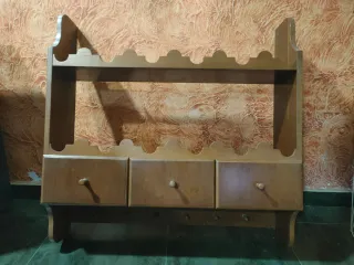 Mueble de madera maciza con un diseño antiguo y elegante. - Tres cajones con tiradores redondos. - Estante superior con borde decorativo. - Estructura robusta y duradera. No bajo precio y no envío este mueble. Vienes y te lo llevas.