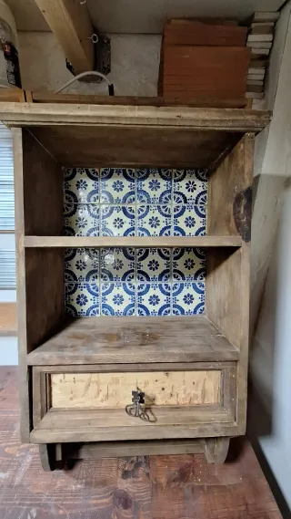 Mueble alacena con un diseño rústico y detalles decorativos. El cajón está por restaurar - Estructura principal de madera. - Panel trasero con azulejos de cerámica. - Un cajón con tirador.