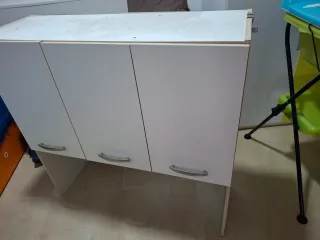 Mueble alacena de tres puertas con tiradores plateados. Su diseño moderno se adapta a diferentes espacios. - Acabado en color blanco. - Fabricado en madera y plástico. Aún Es funcional,lo vendemos por mudanza. En las fotos aparece desmontado,pero va unido.
