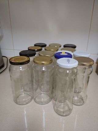 Hago LOTES con DESCUENTO del 50%! Botes de vidrio para almacenaje de alimentos, conservas o alacena. Dos tamaños: 10 de 570gr 5 de 345gr En total 15 Botes! Tengo más de los dos tamaños, por si necesitas más Sólo usados una vez! En perfecto estado Envíos solo de 15 botes como máximo