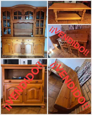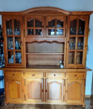 Ver ofertas abajo Mueble alacena de madera de pino, ideal para comedor. Cuenta con vitrinas y amplios compartimentos. - Diseño rústico y elegante. - Madera maciza natural de pino. - Puertas con detalles. - Estantes interiores. Si compras también mesa y sillas de comedor, lo dejo en 190€. Si compras con dormitorio, lo dejo en 190€. Compra de Alacena, dormitorio, mesa y sillas. Todo 220€. Ver todo en mis productos. Está en buen estado. No reservo el primero que compre se lo lleva. Desmontaje y transporte por parte del comprador.