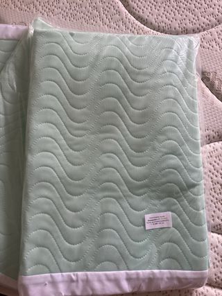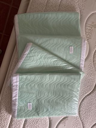 Travesero o empapador para cama, ideal para proteger el colchón. Presenta un diseño acolchado con ondas. - Borde de tela blanca. - Color verde menta, azul por debajo Con alas para poder meter y sujetar con el colchón 4 unidades 1 unidad por 25€ las 4 por 80€