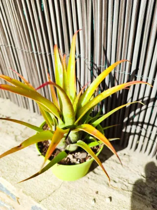 Planta familia de las bromelias en maceta de color verde brillante. Sus hojas presentan tonalidades verdes y rojizas, con puntas afiladas. - Planta adaptada al exterior (frío/calor) - Maceta de plástico. - Hojas con bordes dentados. Pedido mínimo 10€