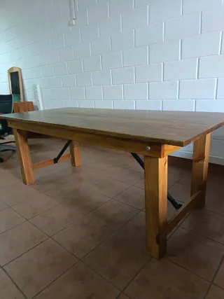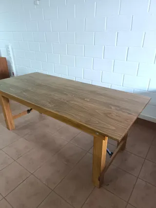 Mesa de madera con un diseño robusto y elegante. Es plegable, lo que facilita su almacenamiento y transporte. - Tablero de madera. - Estructura metálica. - Diseño plegable. Están nuevas con su embalaje.