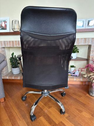 Silla de oficina con un diseño moderno y cómodo. - Respaldo alto con malla transpirable. - Asiento acolchado. - Base giratoria con ruedas. - Mirar 3 desperfectos en fotos: desgaste estético en la base giratoria de las ruedas y dos pequeños agujeros en la malla (no afecta al uso).