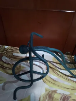 Original portavelas con diseño de bicicleta, ideal para dar un toque decorativo. Estructura de metal.Incluye vela amarilla con detalles florales.mide de rueda a rueda 25 centímetros y alto 14 centímetros.