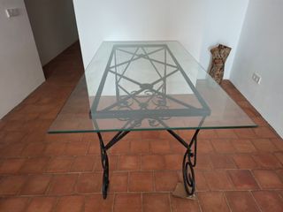Elegante mesa de centro con sobre de cristal (1,2 cm) y base de hierro forjado. - Diseño moderno y robusto. - Patas con detalles ornamentales en espiral. - Marco metálico negro para el cristal.