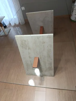 Elegante mesa de comedor con una combinación de materiales que aportan un toque moderno y sofisticado. - Encimera de cristal transparente. - Base de madera con detalles en mármol travertino.