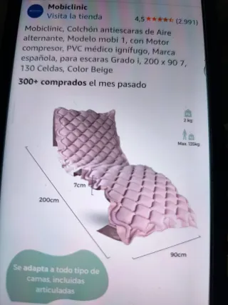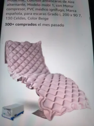 Colchón antiescaras de aire alternante Mobiclinic, modelo Mobi 1. Incluye motor compresor y está fabricado en PVC médico ignífugo. - Color Beige. - Medidas: 200 x 90 cm. - Grosor: 7 cm. - Capacidad: 130 celdas. - Peso máximo soportado: 135 kg. - Peso del producto: 2 kg. - Se adapta a todo tipo de camas, incluidas articuladas.