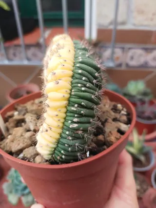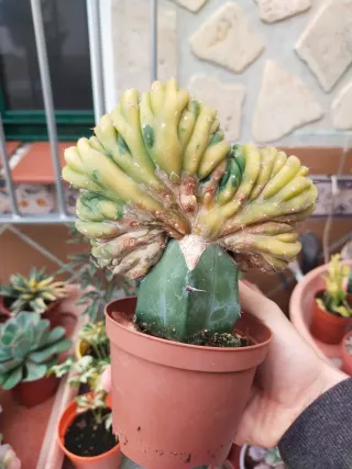 Planta de cactus Trichocereus Pachanoi crestado, con variegación aurea. Simetría perfecta. En sus propias raices ✨