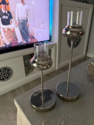 Elegantes porta velas que añadirán un toque de distinción a tu hogar. El diseño combina metal plateado con detalles de cristal transparente. - Set de dos porta velas. - Base redonda y estable. - Cuerpo estilizado.