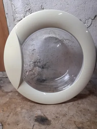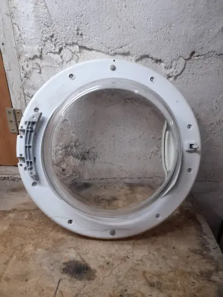 Puerta de repuesto para lavadora INDESIT WIL 85. Pieza de recambio en buen estado. - Diseño circular con marco blanco. - Ventana de cristal transparente.