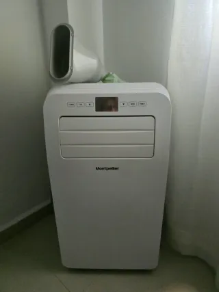 Aire acondicionado portátil de la marca Montpellier, con solo 2 meses de uso. - Color blanco. - Fabricado en plástico resistente.