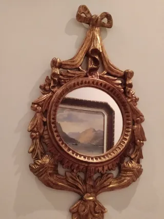 Elegante espejo con marco decorativo estilo cornucopia. Su acabado en pan de oro le da un toque de distinción. Medidas:( Largo 70 cm× ancho 37'5 cm) - Marco con detalles ornamentales. - Diseño colgante. Está cubierto en PAN de oro , es un trabajo personalizado. (Resina). Posibilidad de rebajar un poco!
