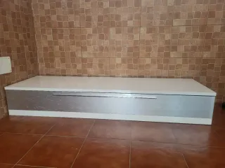 Conjunto de mesa y módulos para salón. - Diseño moderno y funcional. - Acabado en blanco y plateado. - Ideal para organizar tu espacio.interesados preguntar medidas de cada modular y mesa extensible!gracias.