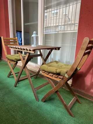 Conjunto de mesa y dos sillas plegables de madera, perfectas para balcones o terrazas pequeñas. Son fáciles de guardar y transportar. - Mesa plegable de madera. - Dos sillas plegables de madera con cojines verdes.