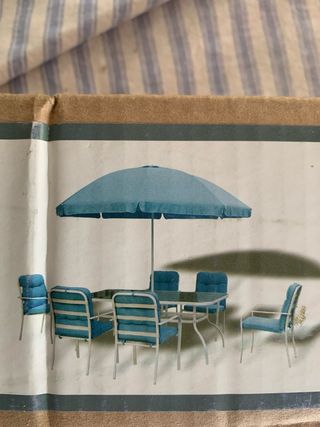 Sombrilla + mesa + 6 sillas azules