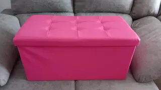 Práctico puff baúl con un diseño moderno y elegante. Ideal para añadir un toque de color y funcionalidad a cualquier espacio. - Acabado en polipiel. - Color rosa vibrante. - Diseño capitoné en la tapa.